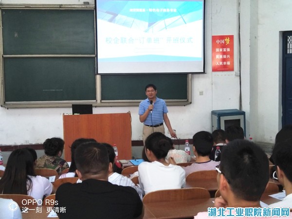 两位企业代表针对订单班的培养目标和培训流程向同学们作了详细介绍。随后,经贸系主任孔祥银对企业专家一行表示热烈欢迎,希望双方以此次订单班的签订走向更加长远务实的合作,同时对电商学子提出了殷切期望,鼓励同学们抓住良好的机会,在顶岗实习前强化自己的专业技术,慎重选择适合自己的岗位,坚定目标,祝愿大家走好人生第一步,用知识和才干回报公司和社会。