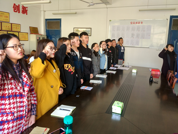 入党宣誓仪式在慷慨激昂的《国际歌》声中开始,10名刚批准入党的预备党员在杨波的带领下预备党员面向党旗,举起右拳,庄严宣誓。每个同学都用发自内心的声音抒发着对党忠诚的决心。预备党员代表李盖同学站在党旗下发表了感言,表示要认真践行入党誓词,做合格党员。杨波对各位入党的同学表示祝贺,希望大家再接再厉,不仅从形式上入党,更要从思想上、行动上入党,切实发挥党员的先锋引领作用。