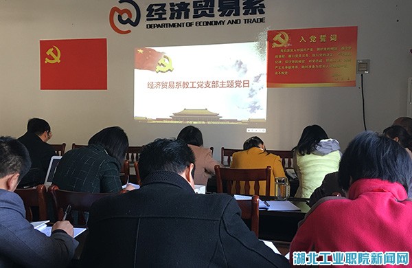 新闻网讯(文/玉声图/熊学发)11月10日,经济贸易系教工党支部在3409召开了“做合格党员凝心聚力为建设国家优质高职贡献力量”主题党日活动。经贸系教工党支部书记郝静主持会议,全体教师党员参加主题活动。