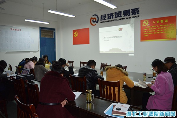 首先,经贸系教工支部全体党员在党总支副书记瞿万军的带领下学习《关于新形势下党内政治生活的若干准则》,明确了新形势下严肃党内政治生活的具体规定和推进全面从严治党的要求。紧接着,教工党支部组织委员杨波领学十堰市换届办《关于转发省换届办〈湖南通报13起违反换届纪律问题典型案例〉的通知》(十换届办[2016]12号)和《关于换届风气巡察发现问题的通报》(十换届办[2016]20号)文件,要求大家认真领悟文件精神,汲取反面教训,确保换届工作顺利进行。教工党支部书记郝静宣读“九严禁、九必须”换届纪律要求之后,全体党员共同观看警示教育片《镜鉴》,以剖析湖南衡阳破坏选举案和四川南充拉票贿选案为警戒,进一步增强遵规守纪意识。此外,每位教工党员现场领取严肃换届纪律提醒函,并签订严守换届纪律承诺书。