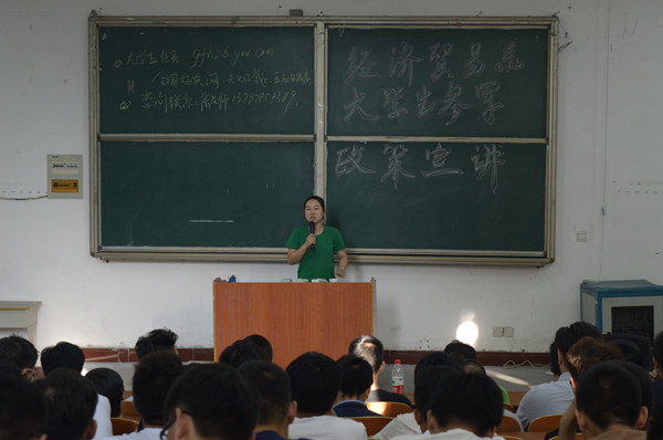 新闻网讯(通讯员文/熊大双图/罗岩莲)为响应国家征兵工作号召,积极落实有关征兵会议的精神,经济贸易系于6月15日特邀公司武装部胡现敏处长进行老员工参军政策的解读与宣讲。经贸系党总支书记张玲、全体辅导员及在校男生聆听了宣讲。