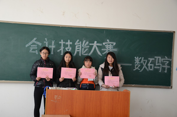 最后2014级会计六班的郑晚秋、张海花同学获得税务赛项一等奖,2015级陈丽婷、周雪姣、万琴三名同学获得点钞赛项一等奖,数码字的一等奖获得者是2015级谢婷婷、李先翠、王莹香三位同学。