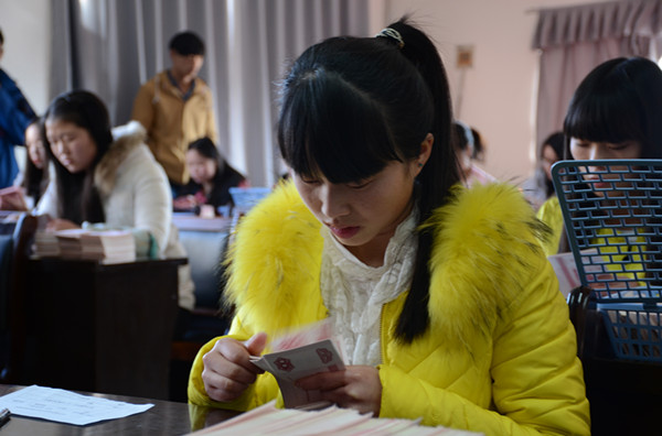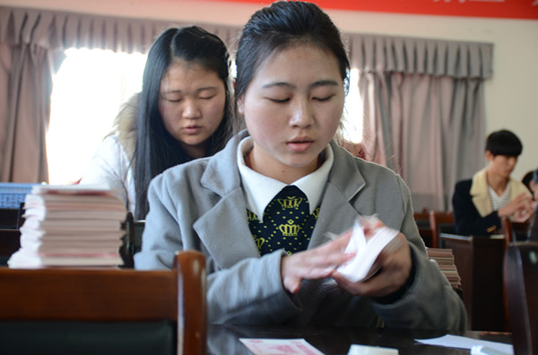 14:30,点钞大赛与数码字书写比赛在3425、3508教室同时进行,点钞比赛规则是在短短五分钟内将点钞券分为一百张一叠,在相同时间内,点钞最多且准确率较高者获胜。比赛开始,参赛的选手们纷纷起钞,点钞手法各式各样,现场精彩纷呈。数码字书写相对简单明了,在规定时间里写好由评委评出获奖员工。