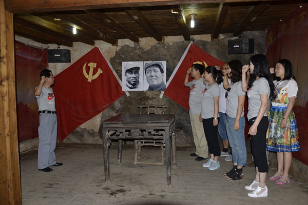 在当年的作战会议室中,经贸系党员干部共同面对党旗进行入党宣誓,重温入党誓词,接受党性教育。
