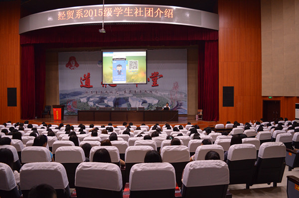 新闻网讯(通讯员 骆诗婷)9月5日上午,经济贸易系在会议中心进行新生入学教育,系员工会主席赵凯利用一款新颖活波的自制手机网页应用向2015级新生们展示了该系团总支员工会和拟招募新人的八个部门。