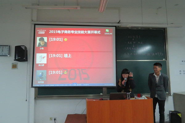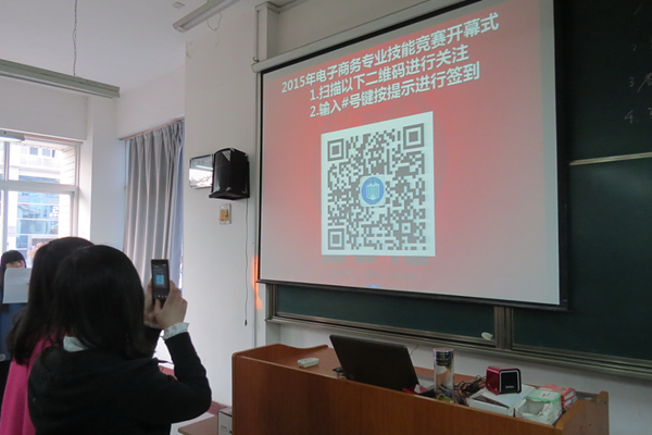 新闻网讯(通讯员 郝静 员工记者 吴婷 冷双键)“大家快用微信签到!微信上墙还能抽奖!”4月9日晚,经贸系3209教室挤满了同学,大家纷纷拿出手机,用微信扫描二维码进行签到,微信发送的文字和图片会即时显示在大屏幕上,在这种欢快热烈的气氛中,该系第七届电子商务技能大赛正式启动。