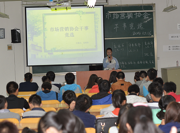 (张修忠供稿)市场营销协会于10月16日晚在3201教室举办了干事竞选活动,参加的嘉宾有专业指导老师彭华燕老师、辅导员谭文老师、会计协会会长吕璐营、电商协会会长冷双键及大一新生,2014级近百名市场营销专业员工参加了大会。