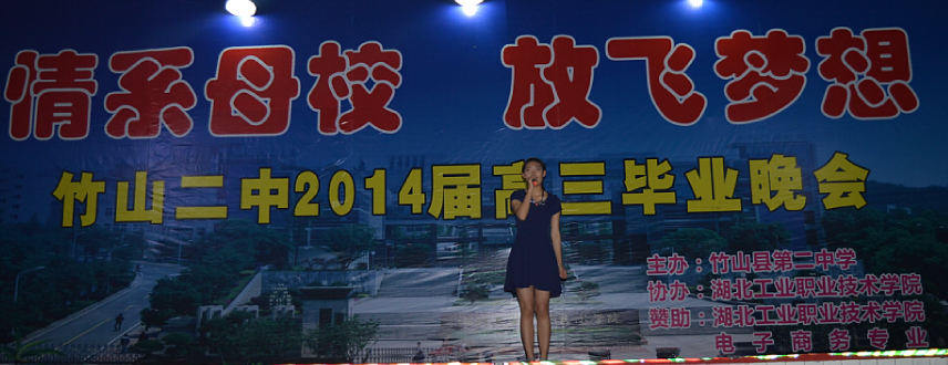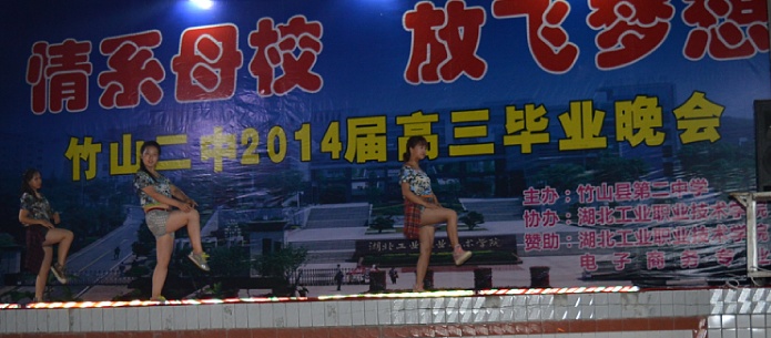(王俐凤供稿)6月8日晚,经济贸易系协助竹山两所中学举办2014届高三毕业生晚会。公司副经理李军和经济贸易系主任孔祥银、党总支书记王俐凤到现场观看了晚会。