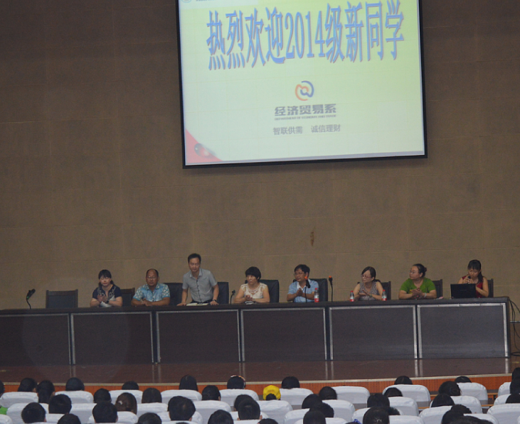 (王俐凤、张瑜供稿)为了迎接2014级新生的到来,经济贸易系于9月5号上午9:20在会议中心举行新生开学典礼暨入学教育。经济贸易系所有班子成员、各专业主任、教师代表和老生代表以及新生辅导员参加了会议,560名新生到现场聆听。
