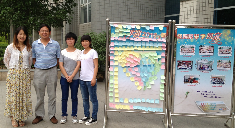 学弟学妹为了表达对学长的送别之情,制作了“欢迎经贸系学子回家!”展板,并在留言板上送上温馨祝福,祝愿他们工作顺利,万事如意!