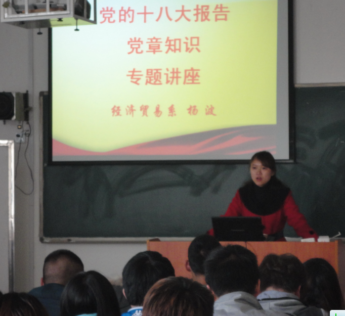 为了进一步学习党的十八大报告精神和党章的知识,增强同学们对党的认识,以党建带团建。3月15日中午,经济贸易系在3505教室举行了学习党的十八大报告和党章知识竞赛活动。系团总支书记杨波主讲,员工入党积极分子和预备党员参加了学习。