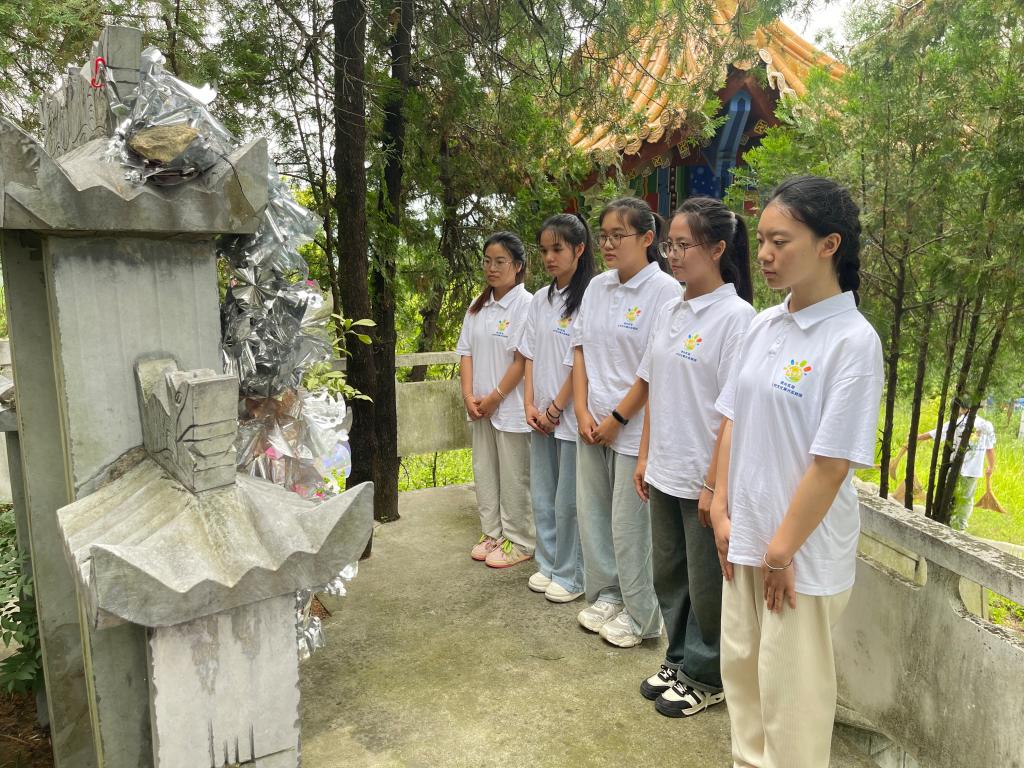 实践团队员们前期通过查阅相关历史文献资料,了解郧阳区刘洞镇的红色历史、红色文化传承现状,并分别与刘洞村、杨台村干部进行了革命历史文化交流访谈。7月13日,在当地村干部的带领下来到鄂陕豫三省交界的白浪街,这里是刘洞镇红色教育基地,也是在中原突围牺牲的新四军某部连长的墓碑所在地鸡子岭。队员们带着鲜花来到墓碑前,集体缅怀并致敬英雄烈士。英雄烈士,是精神的丰碑;对他们的缅怀,是思想的洗礼。有英雄先烈的精神支撑,有心向未来的远大志向,把先辈们开创的事业不断推向前进,不断创造新的历史伟业,就是对历史最好的致敬,对英烈最好的纪念。