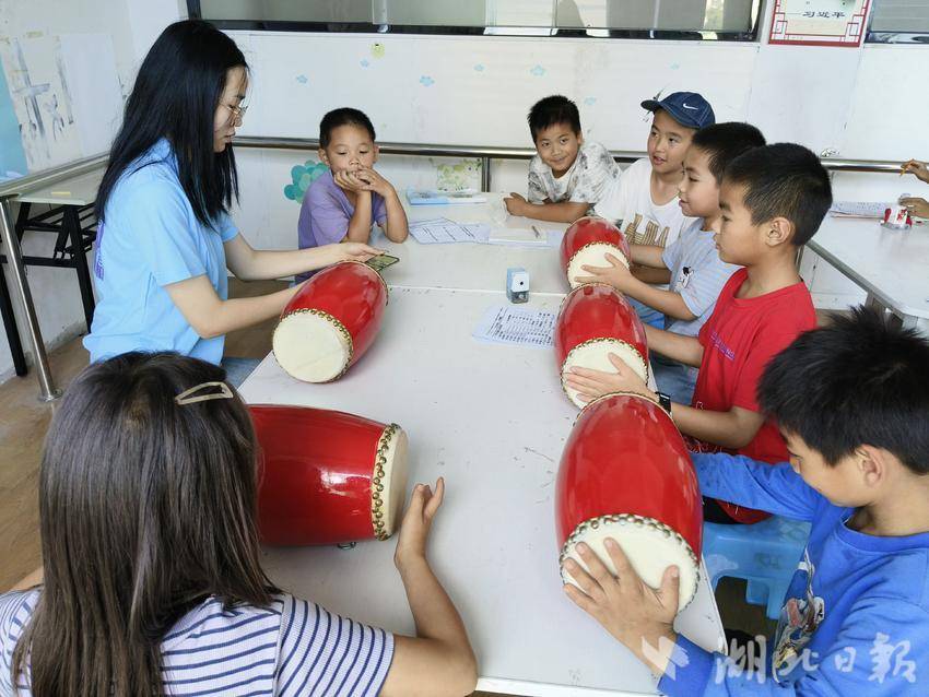 安全课堂上,志愿者结合暑期开展了防溺水、防范山洪暴雨、防中暑、交通安全等安全自护教育,帮助孩子们提升安全意识,掌握安全自护知识,学习安全自救技能。奥尔夫音乐课堂上,李波艳带孩子们打起了腰鼓,欢快的音乐节奏让大家爱不释手。李波艳觉得很有成就感,“孩子们是第一次接触奥尔夫音乐,从大家脸上的笑容就能看出他们非常喜欢!”