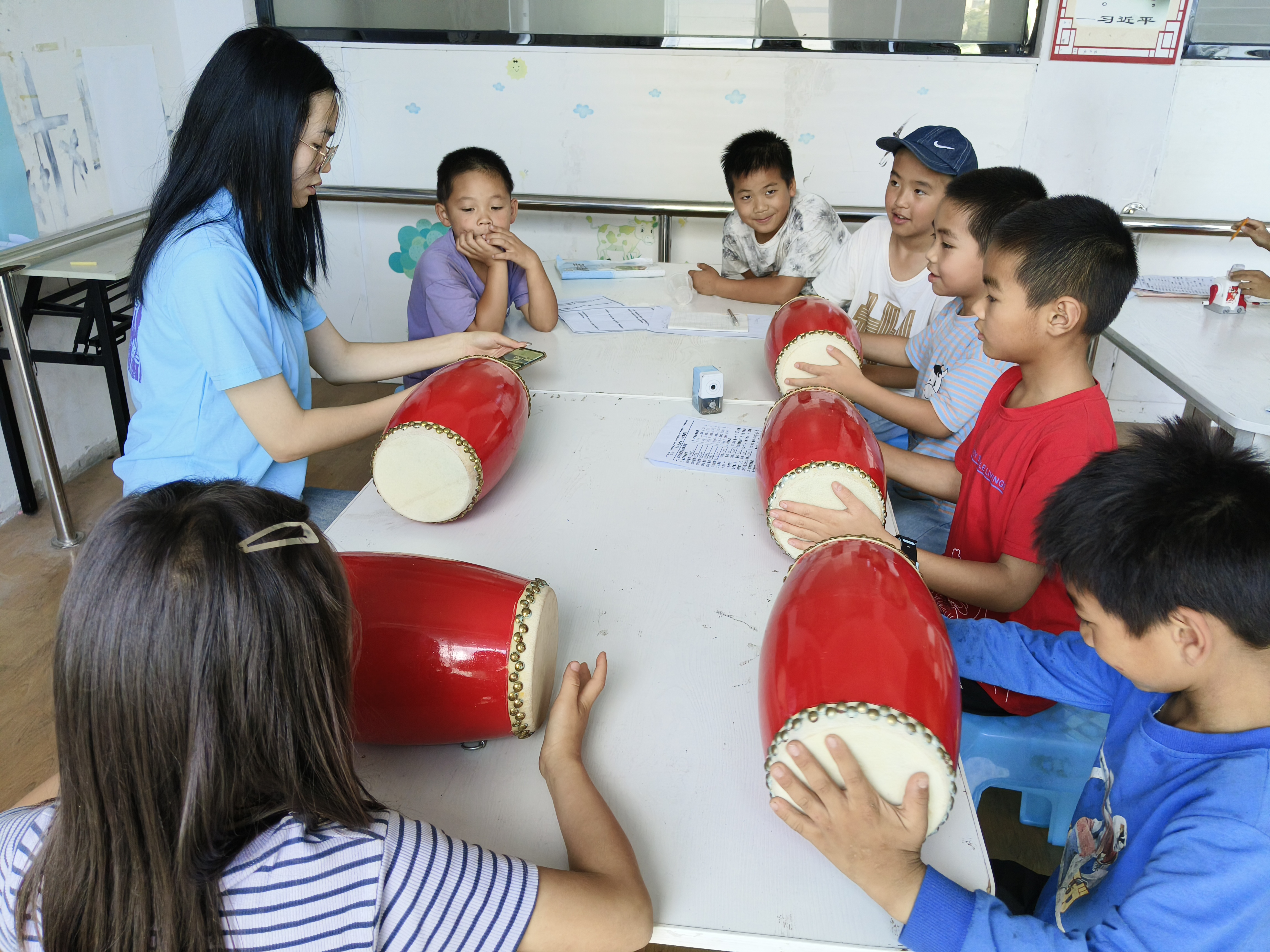 (志愿者教孩子们打腰鼓)