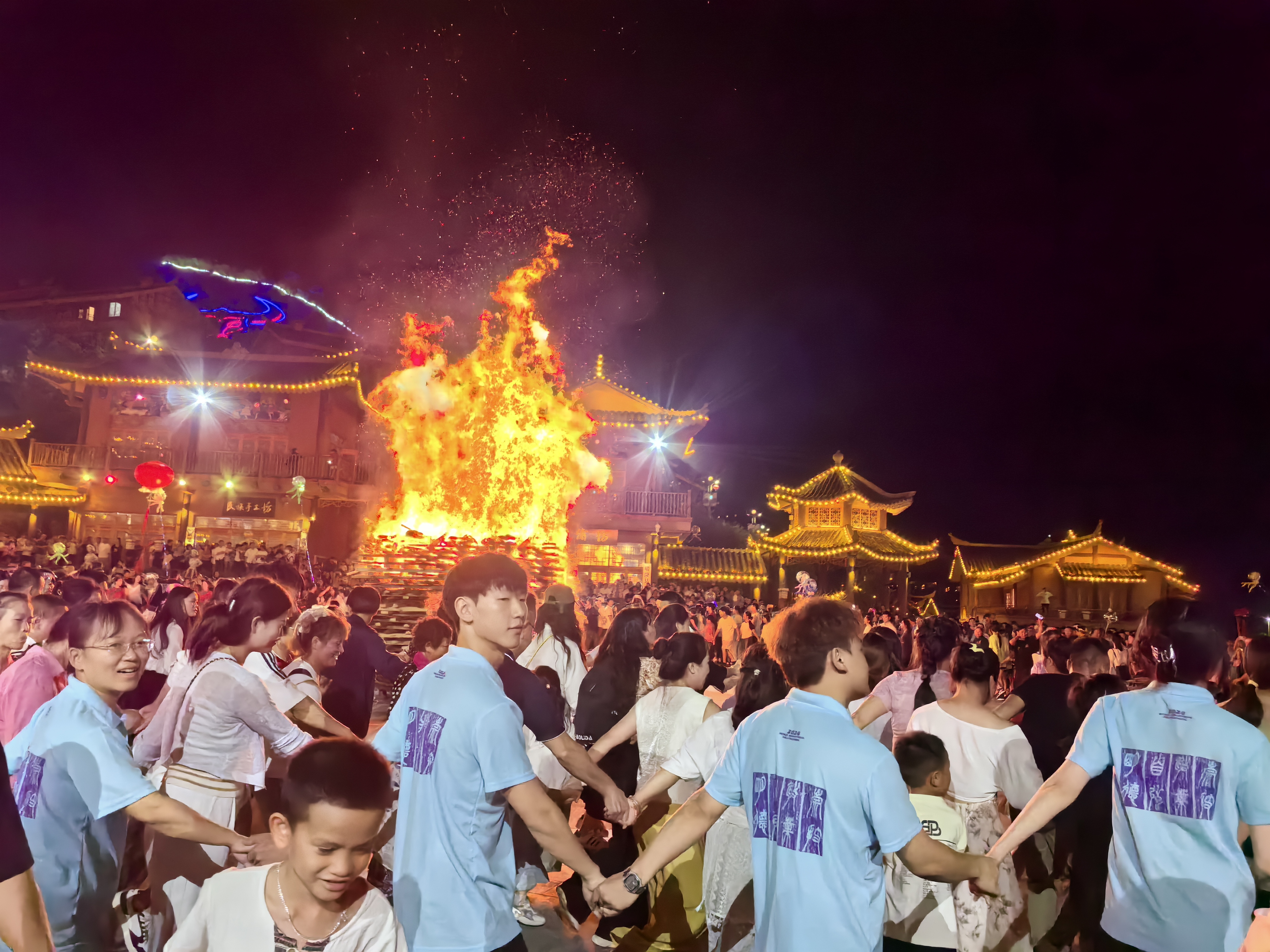 7月28日,正赶上晴隆县阿妹戚托小镇举办第十四届彝族火把节,湖北工业职院晴隆县老员工志愿服务队有幸现场感受这一隆重、盛大、富有浓郁民族特征的彝族节日。火在彝族中有着独特的意义,火不仅代表彝族的质朴温暖,也代表彝族儿女的热情奔放,更是彝族人民生生不息、开拓进取的精神指引。彝族火把节不仅是彝族人民传承文化、庆祝丰收的节日,也成为了促进民族团结、展示民族文化的重要平台。