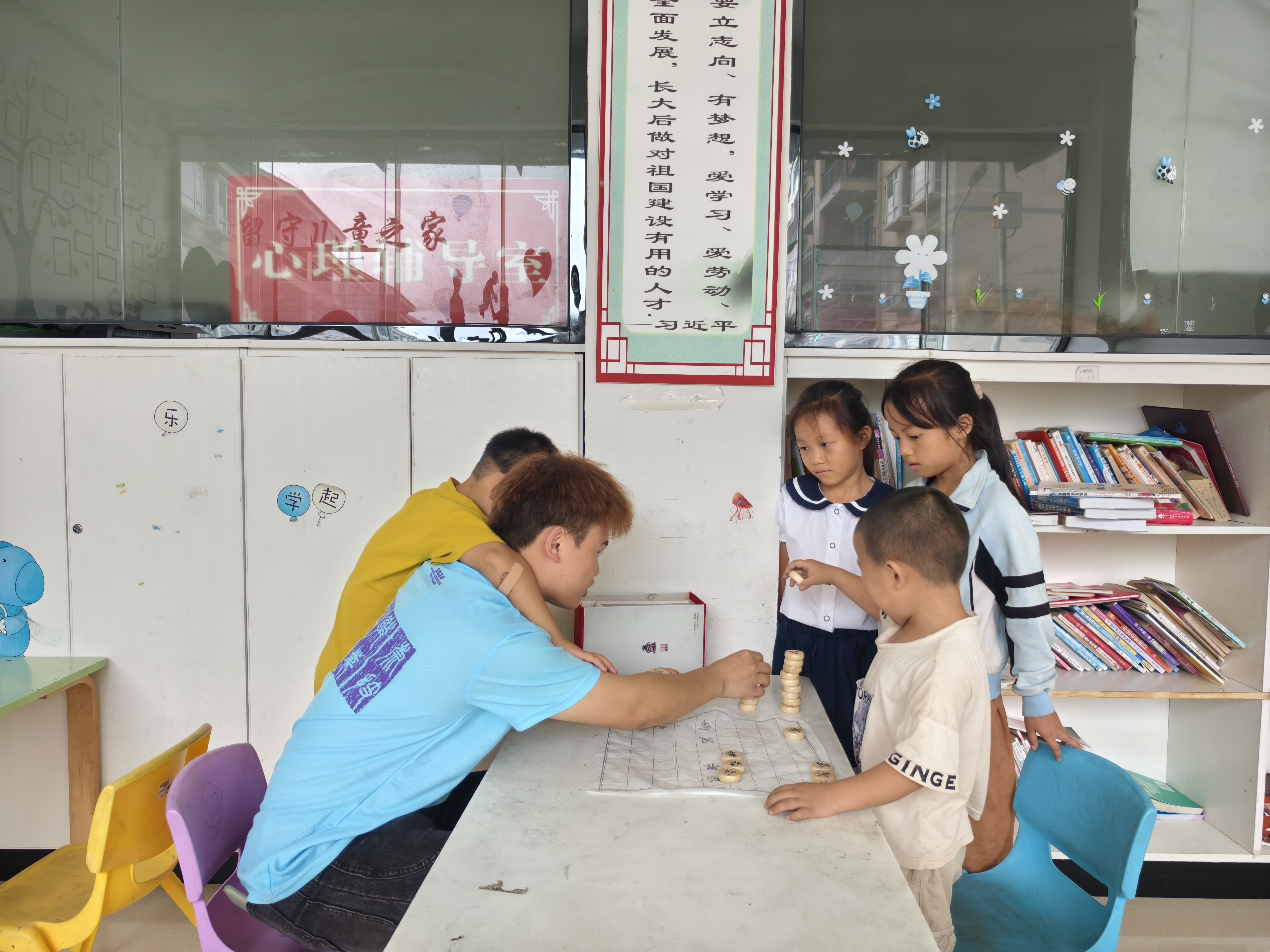 (志愿者陪孩子们下象棋)