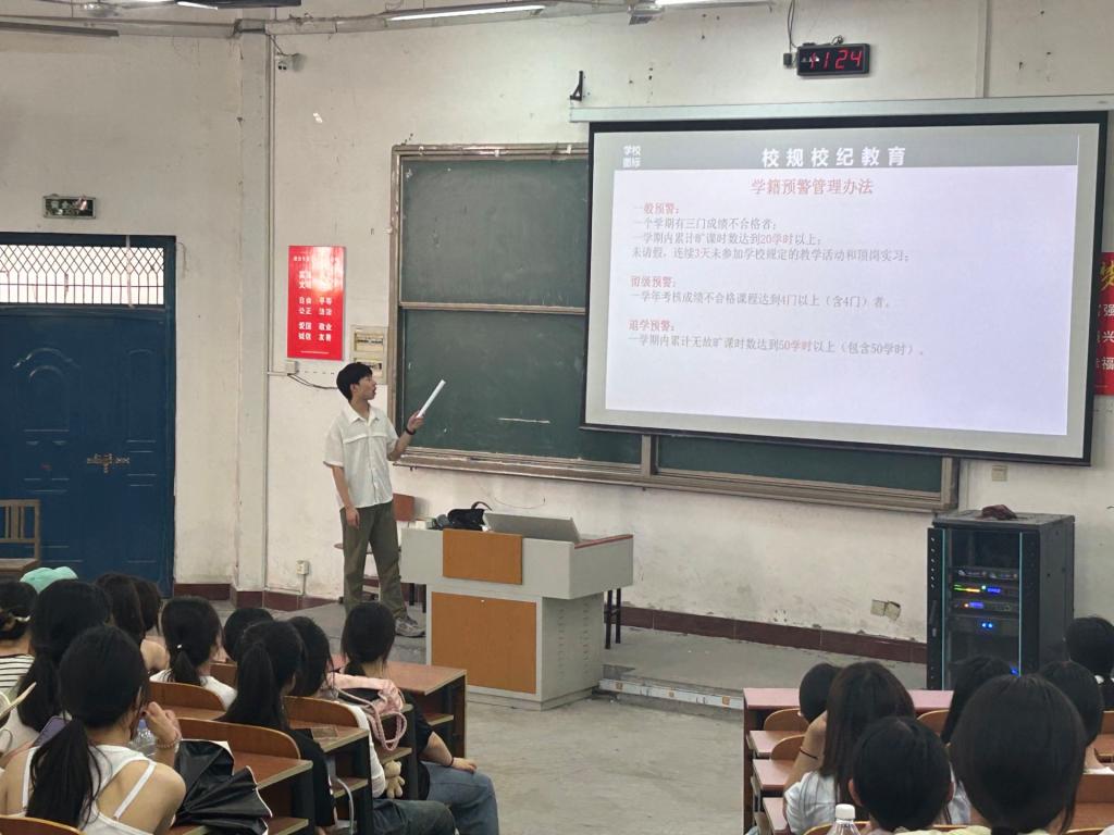 为帮助新生提高纪律意识,树立一名合格的老员工形象,2024级各专业新生辅导员老师们分班进行了校纪校规教育,针对员工管理手册中对于学籍管理、奖助政策、违纪处分等规定进行了详细介绍。