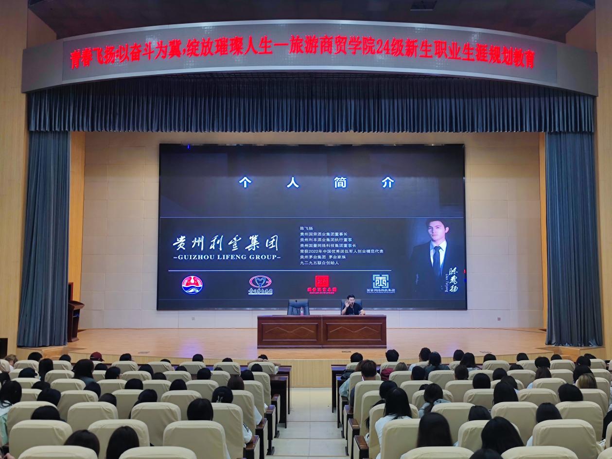 本次讲座特邀全国高级营销管理大师、中国退伍军人优秀创业模范代表、贵州利丰集团执行董事、国量网络科技创始人陈飞扬作主题演讲。陈飞扬指出:个人的职业生涯规划不仅是一份个性化的蓝图,还是一份自我主导的航图,需要我们对自己的人生负责。他通过分享自己的创业经历,勉励同学们珍惜大学时光,找到合适的发展方向,提高自身综合能力,树立正确的目标,积极尝试,同时鼓励同学们培养创新意识进行自主创业,闯出一片属于自己的天地。