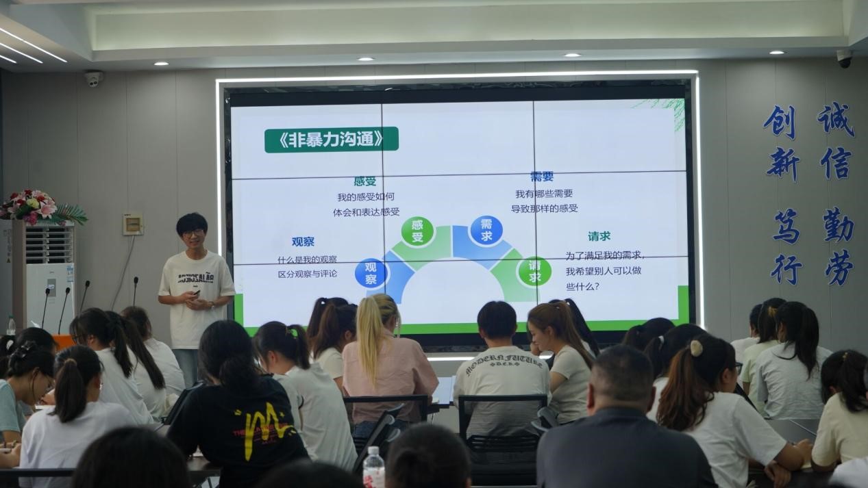 随后,班会聚焦宿舍矛盾、小组合作分歧等员工日常高频冲突场景,剖析冲突背后的情绪诱因,引导员工探寻情绪根源。班会引入马歇尔・卢森堡的“非暴力沟通”理论,详解“观察→感受→需求→请求”四步沟通法则,并通过情景模拟、角色扮演开展实践训练。员工在演练中发现,用需求表达替代指责,能有效化解矛盾,促进沟通。