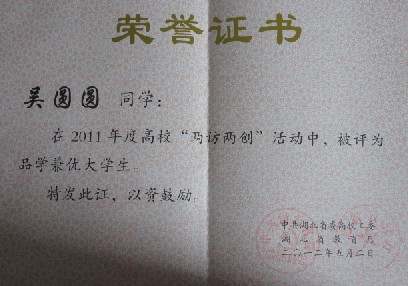 会议表彰了2011年全省高校“两访两创”活动先进单位、先进个人和“优秀教师”、“优秀班主任、辅导员”、“优秀老员工”。我系2009级会计二班员工吴圆圆荣获“优秀员工”称号。