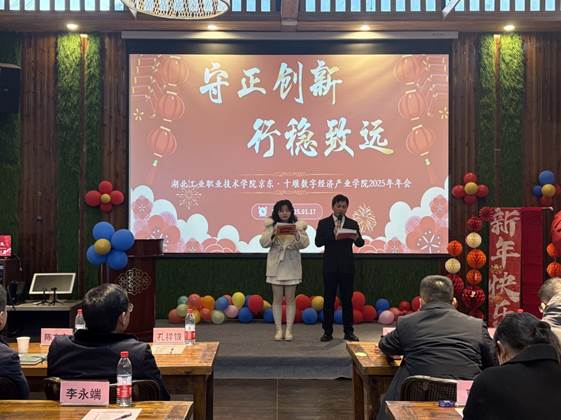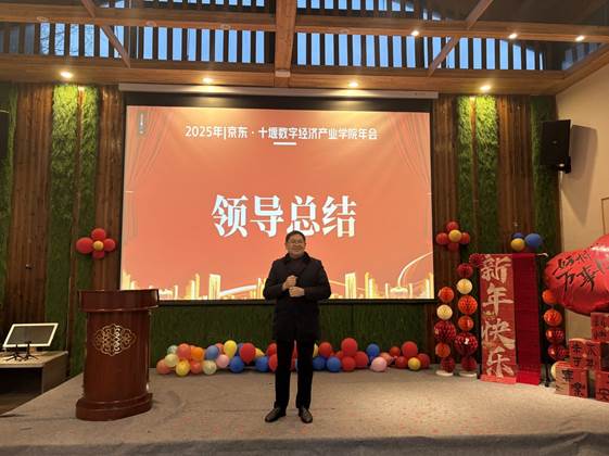 紧接着,京东·十堰数字经济产业公司经理陈方亦做了《守正创新,行稳致远》主题报告,他深入分析了数字贸易产业的发展形势,提出了产业公司未来的发展战略和规划,并强调要坚守教育初心,不断创新人才培养模式,加强产教融合,为地方数字贸易产业发展提供智力支持和人才保障。年会在全体教师朗诵的《我爱上班》中推向高潮,展现了教师们蓬勃向上的精神风貌和校企合作形成的独特文化氛围,进一步凝聚了人心、振奋了精神。