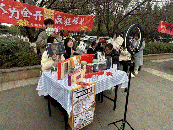 梁聪聪介绍,在产品筛选环节,员工团队发挥专业优势,深入十堰市竹山、竹溪、丹江口等县区开展实地调研,从数百种产品中精选出绿松石、香菇木耳、黄酒等20余种地方特色产品。校内同步建成农特产品展览馆与直播间,为推广销售夯实基础。在竹山县擂鼓镇广山村的崔家蜜生产车间,师生团队全程参与生产流程调研,根据收集的一线数据为合作社量身定制直播方案,推动崔家蜜线上销量持续增长,切实助力农户增收。