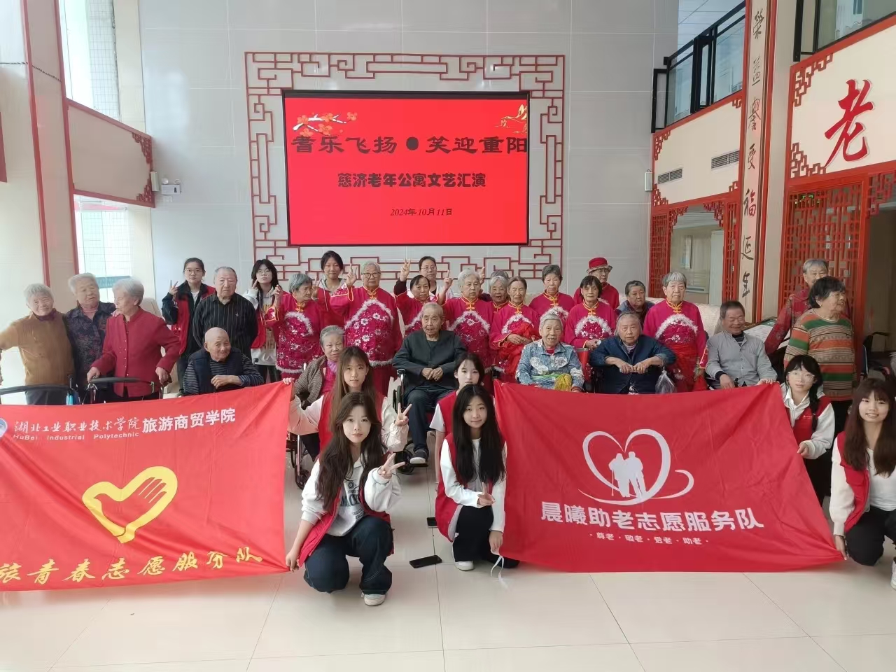 新闻网讯(通讯员王紫琳 喻永康 张云)金秋时节,阳光明媚,为迎接一年一度的重阳节,10月11日,一场温馨有爱的孝老爱老文艺演出活动在慈济老年护理院如火如荼地展开,来自湖北工业职院的数十位青年志愿者们为老人们送上一场精彩纷呈的表演,为他们带来了节日的温暖与欢乐。